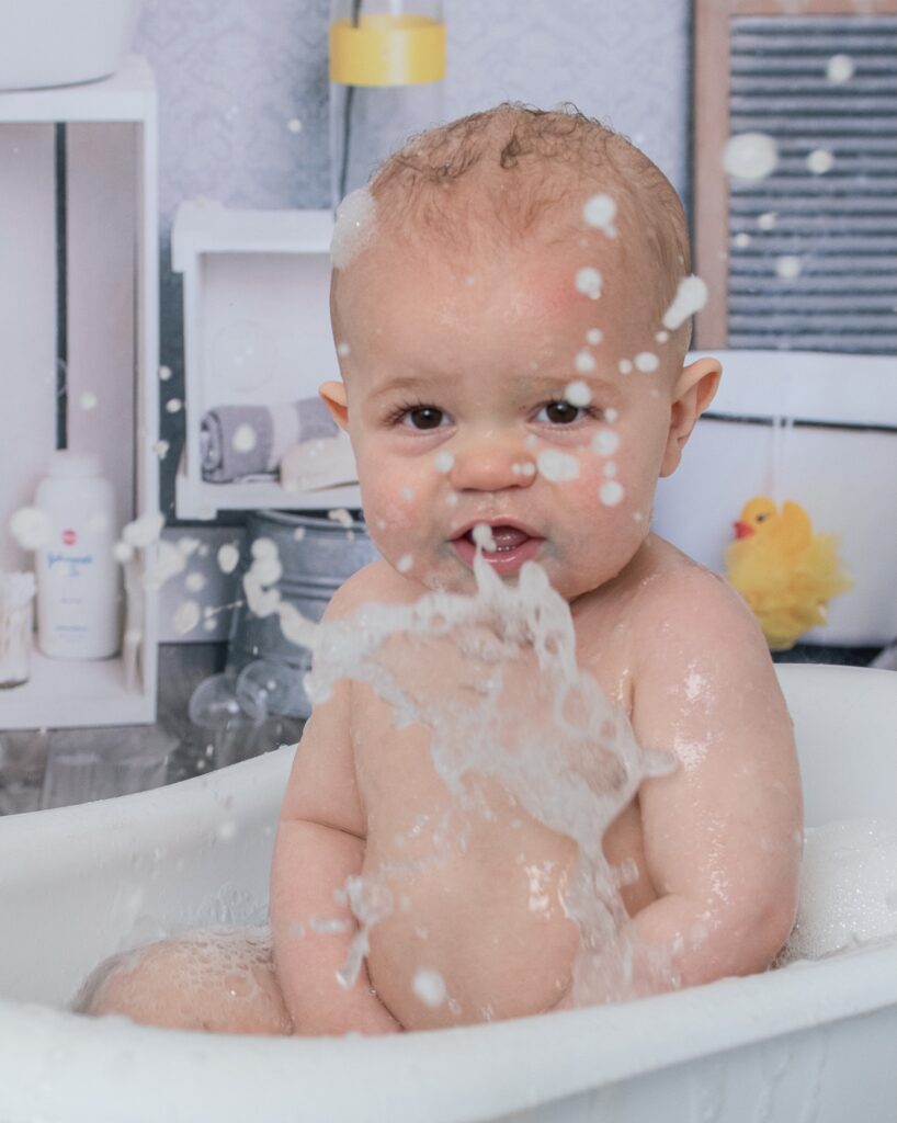 After all the messy fun of the cake smash, it’s time for a little splash! The bath session is the perfect way to wash off the frosting while capturing more giggles, bubbles, and sweet expressions.